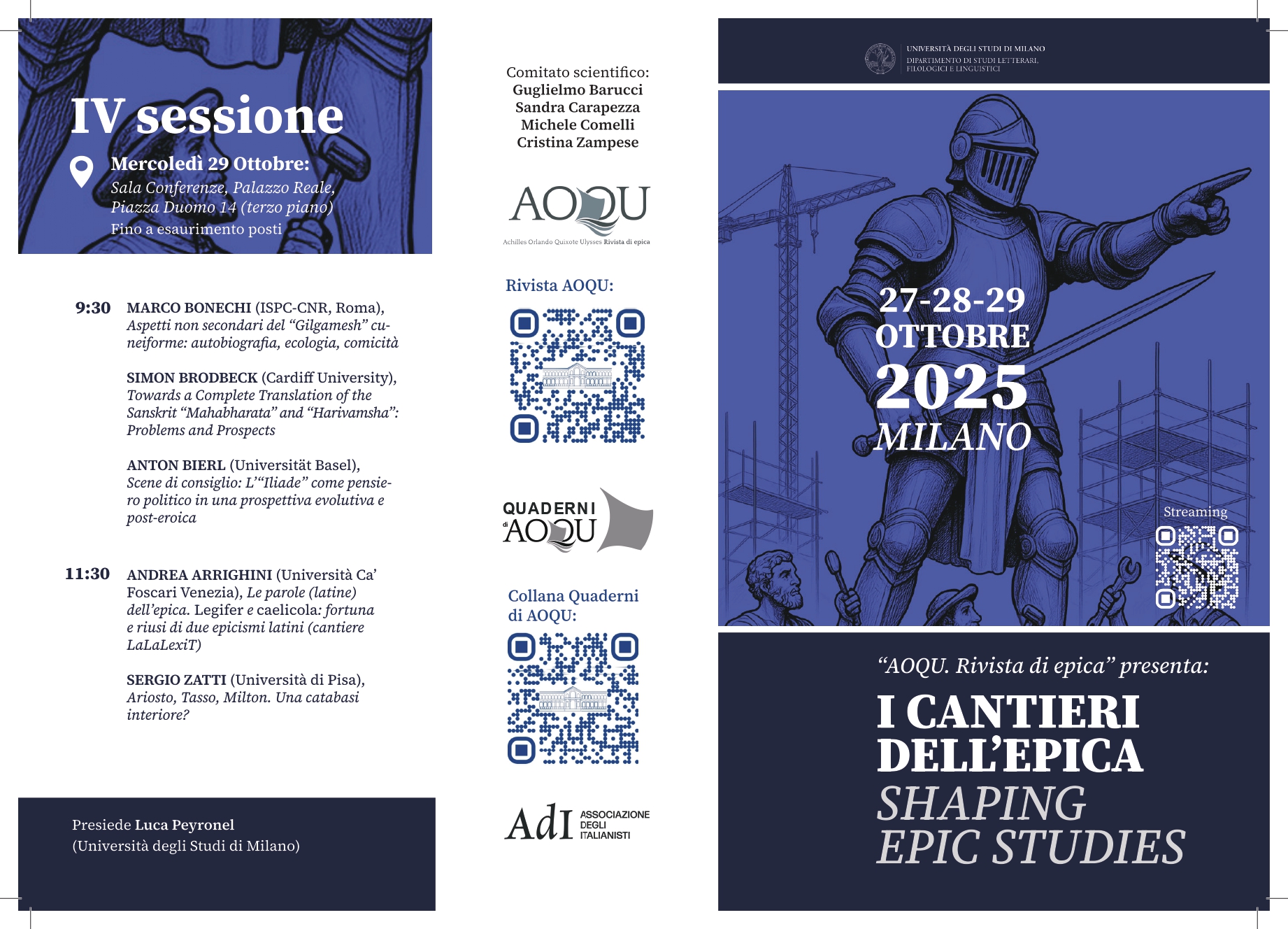 October 15, 2025 Milano, Università degli Studi, 27-29 ottobre 2025, Primo Convegno Internazionale di "AOQU", I cantieri dell'epica/Shaping Epic Studies Per seguire via streaming il convegno clicca qui