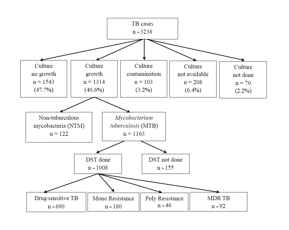 Results: among 1008 TB cases included in study, 77.4% of them were males, 31.5% lived in rural area with median age of 45.0 years (IQR = 23.0), 27.6% were retreatment for tuberculosis, 25.9%, 10.8%, 3.0%, 10.7% and 9.1 were determined to be resistant to isoniazid, rifampicin, ethambutol, streptomycin and MDR-TB, respectively. Adjusted odds ratios (95% confidence interval) of MDR-TB were 5.4 (2.68-11.03), and 4.2 (2.10, 8.45) for retreatment patients, and on treatment patients, respectively.