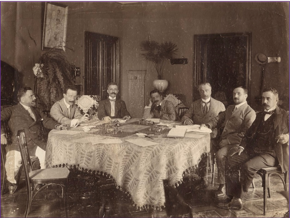 Da sx: Gerolamo Rovetta (1851-1910), Marco Praga (1862-1929), Giannino Antona Traversi (1860-1939), Augusto Novelli (1866-1927), Domenico Oliva (1860-1917), Renato Simoni (1875-1952) e Sabatino Lopez Nunes (1867-1951)