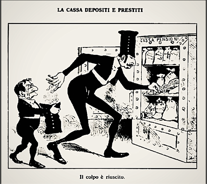 Vignetta satirica sullo scandalo della Banca Romana, da L’Asino del 1892. Giovanni Giolitti (1842-1928) e Bernardo Tanlongo (1820-1896) intenti a svaligiare la Cassa Pensioni