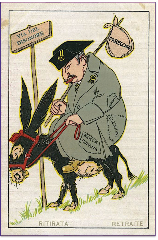 Con i loro articoli umoristici e le mordaci vignette caricaturali che prendevano di mira il sistema di potere in carica, i giornali e le riviste satiriche come Capitan Fracassa (Roma, 1880-1891; 1901-1905) e L’Asino (Roma, 1892-1917; 1922-1925) furono strumenti fondamentali per veicolare attacchi e stroncature politiche. La stampa satirica contribuì a creare un’immagine negativa di Giolitti, spesso accusato di trasformismo, opportunismo e corruzione, andando a erodere la fiducia nei suoi governi e a rafforzare il sentimento popolare di una politica dominata da interessi particolari e non dal bene comune.
