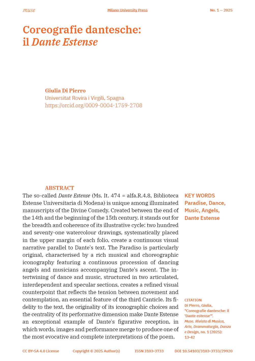 The so-called Dante Estense (Ms. It. 474 = alfa.R.4.8, Biblioteca Estense Universitaria di Modena) is unique among illuminated manuscripts of the Divine Comedy. Created between the end of the 14th and the beginning of the 15th century, it stands out for the breadth and coherence of its illustrative cycle: two hundred and seventy-one watercolour drawings, systematically placed in the upper margin of each folio, create a continuous visual narrative parallel to Dante's text. The Paradiso is particularly original, characterised by a rich musical and choreographic iconography featuring a continuous procession of dancing angels and musicians accompanying Dante's ascent. The intertwining of dance and music, structured in two articulated, interdependent and specular sections, creates a refined visual counterpoint that reflects the tension between movement and contemplation, an essential feature of the third Canticle. Its fidelity to the text, the originality of its iconographic choices and the centrality of its performative dimension make Dante Estense an exceptional example of Dante's figurative reception, in which words, images and performance merge to produce one of the most evocative and complete interpretations of the poem.